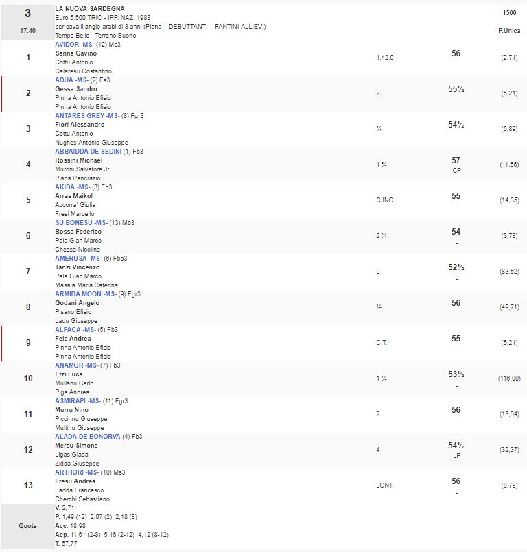 Ippica, Sassari: Oggi 17/06 Risultati 3^ Corsa Vince 3^ Corsa Premio La Nuova Sardegna vinta da Avidor da Fisch e Girantera allevato da Antonio Giovanni Sanna Condividi sul web: Fai clic per condividere su Facebook (Si apre in una nuova finestra) Facebook Fai clic per condividere su WhatsApp (Si apre in una nuova finestra) WhatsApp Fai clic per condividere su Telegram (Si apre in una nuova finestra) Telegram Fai clic per condividere su X (Si apre in una nuova finestra) X Fai clic qui per stampare (Si apre in una nuova finestra) Stampa Fai clic per inviare un link a un amico via e-mail (Si apre in una nuova finestra) E-mail Mi piace Caricamento... Correlati