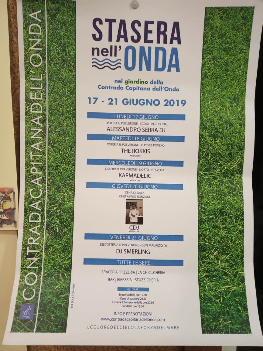- Lunedì 17. Ieri si è cominciato comincia con la serata “Scogli in collina” all’Osteria Il Polverone e con la musica di Alessandro Serra DJ.