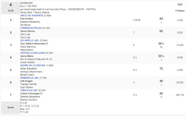 4^ Corsa Premio Costas Est vinta da Unico de Aighenta da Ispanico Sauro e OrchideadeAighenta di poprietà di Dei Maicol e allenato da Deledda Sebastiano