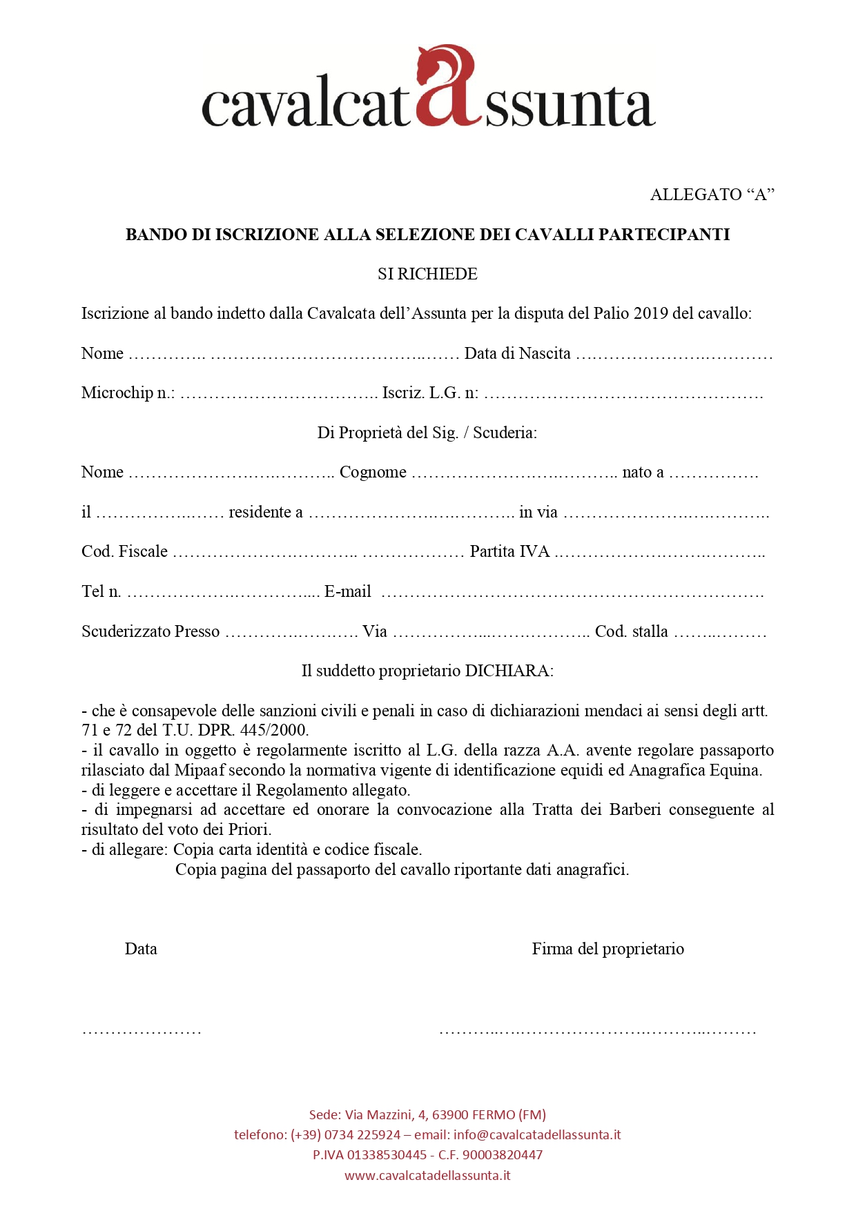 Cavalcata dell’Assunta Fermo: Domenica 14/07 Scade il termine per iscrivere i cavalli Domenica 14/07 scade il termine ultimo per poter iscrivere i cavalli alla Cavalcata dell’Assunta di Fermo che vi ricordo si disputerà il 15/08. Qua sotto già scaricato per chi avesse bisogno di iscrivere il cavallo, il modulo di iscrizione Condividi sul web: Fai clic per condividere su Facebook (Si apre in una nuova finestra) Facebook Fai clic per condividere su WhatsApp (Si apre in una nuova finestra) WhatsApp Fai clic per condividere su Telegram (Si apre in una nuova finestra) Telegram Fai clic per condividere su X (Si apre in una nuova finestra) X Fai clic qui per stampare (Si apre in una nuova finestra) Stampa Fai clic per inviare un link a un amico via e-mail (Si apre in una nuova finestra) E-mail Mi piace Caricamento... Correlati