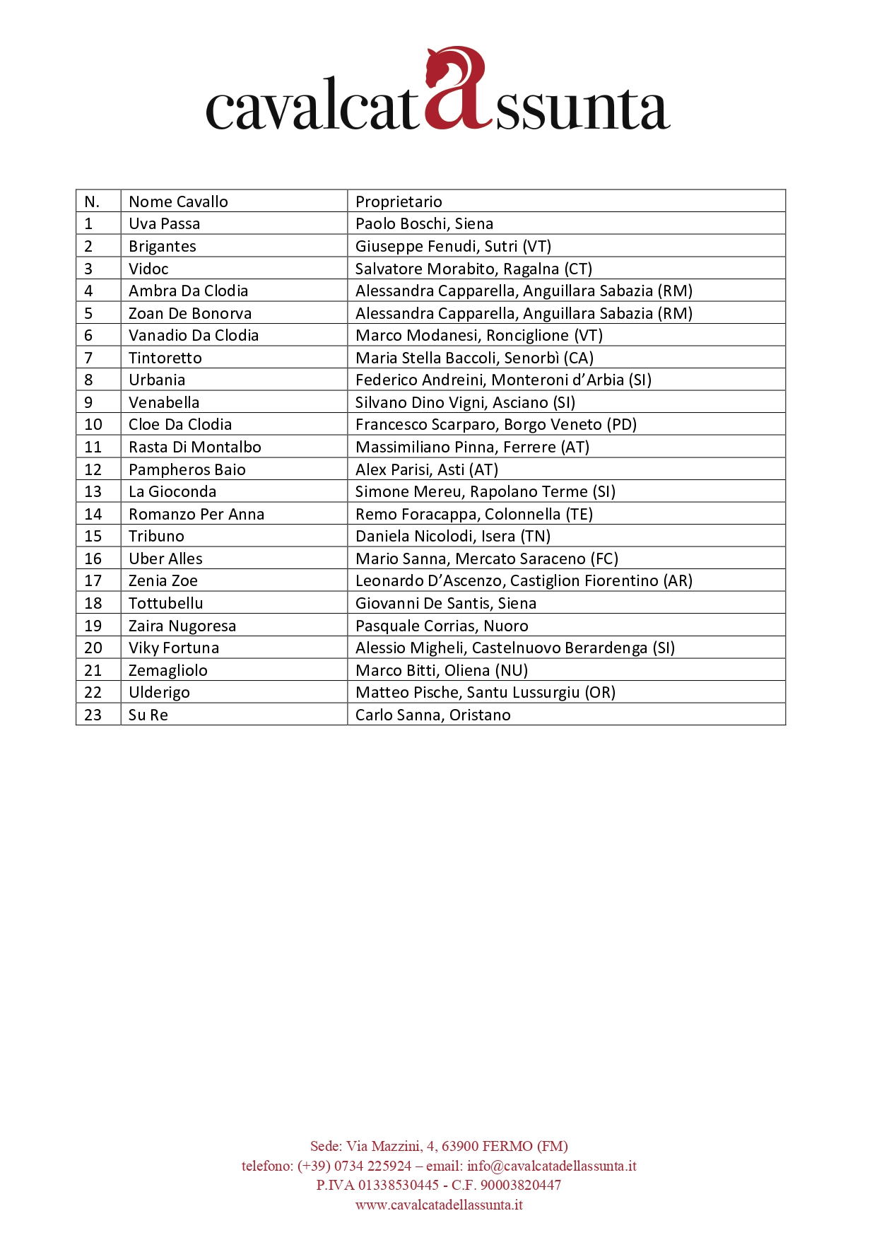 In allegato la lista con i nomi dei cavalli e dei proprietari.