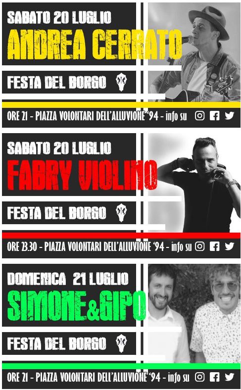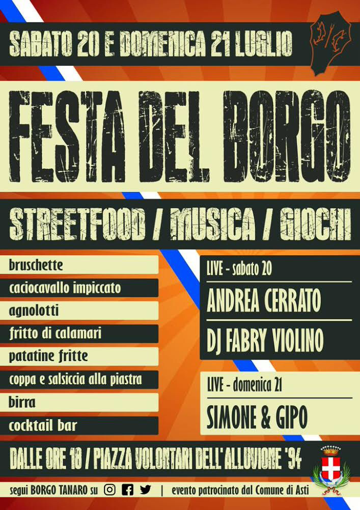 Il Comitato palio del Borgo Tanato-Tricere-Torrazzo organizza per i giorni 20-21/07 dalle ore 18.00 in Piazza dell’Alluvione ’94, la “Festa del Borgo” con Street Food, Musica e Giochi.