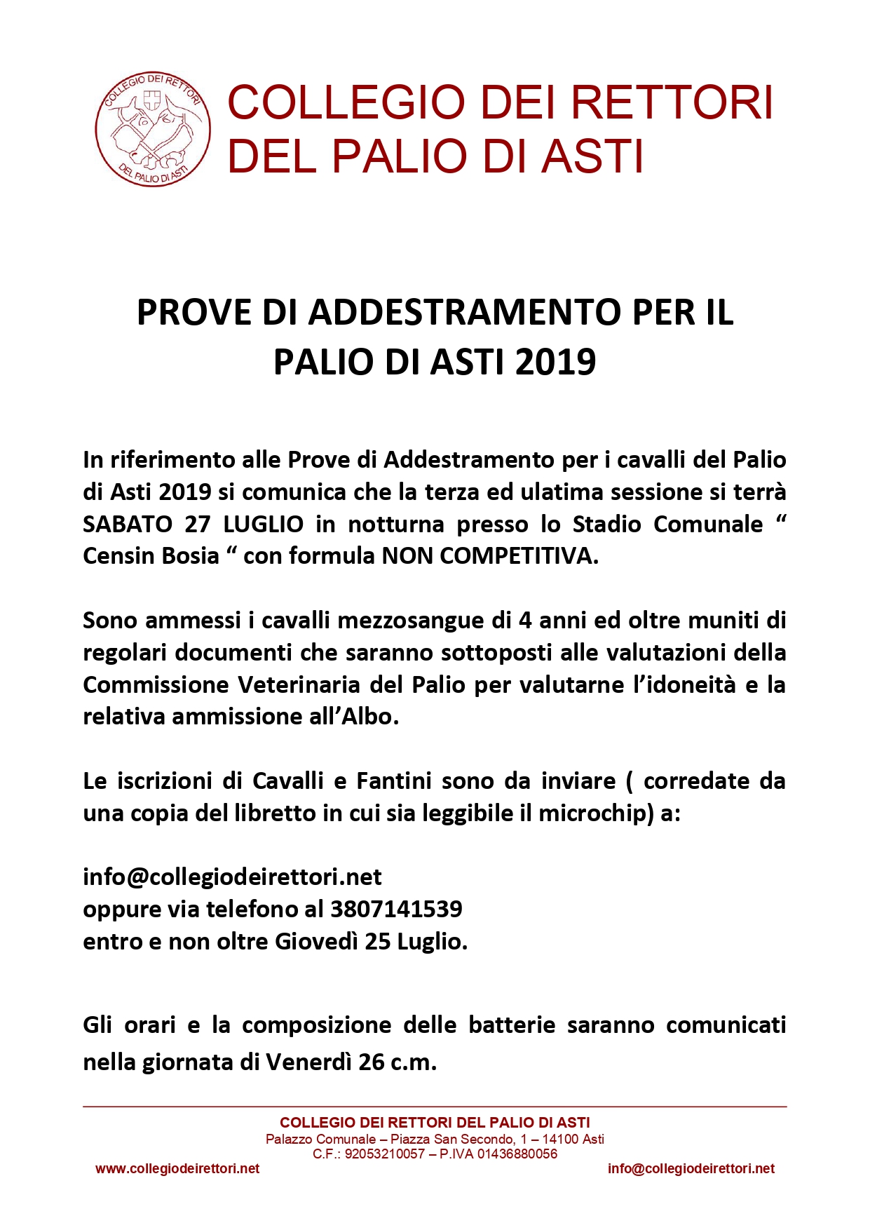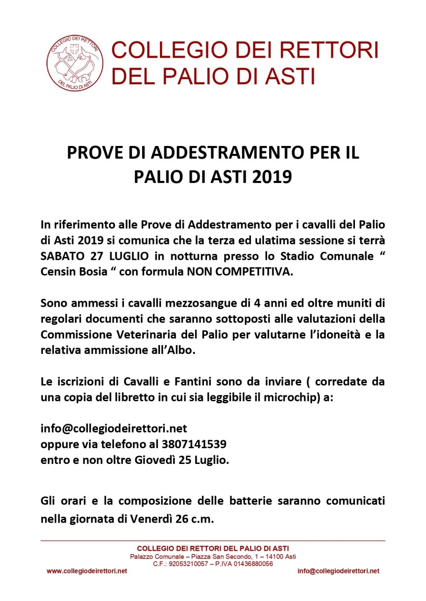 Sabato 27/07 ad Asti presso lo Stadio Censin-Bosia si terrà il terzo e conclusivo appuntamento con le Corse di Addestramento al Palio del 01/09. i cavalli correranno nuovamente in notturna e con Formula non competitiva.