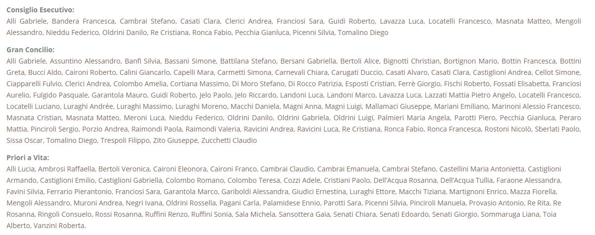 “In un’assemblea di Gran Concilio che ha visto la partecipazione del 90% degli aventi diritto al voto, è stato confermato per acclamazione il capitano Stefano Cambrai. Dopo aver salutato con emozione Lucia Alli e Andrea Castiglioni, castellana e scudiero degli ultimi due anni, ha nominato i nuovi reggenti.