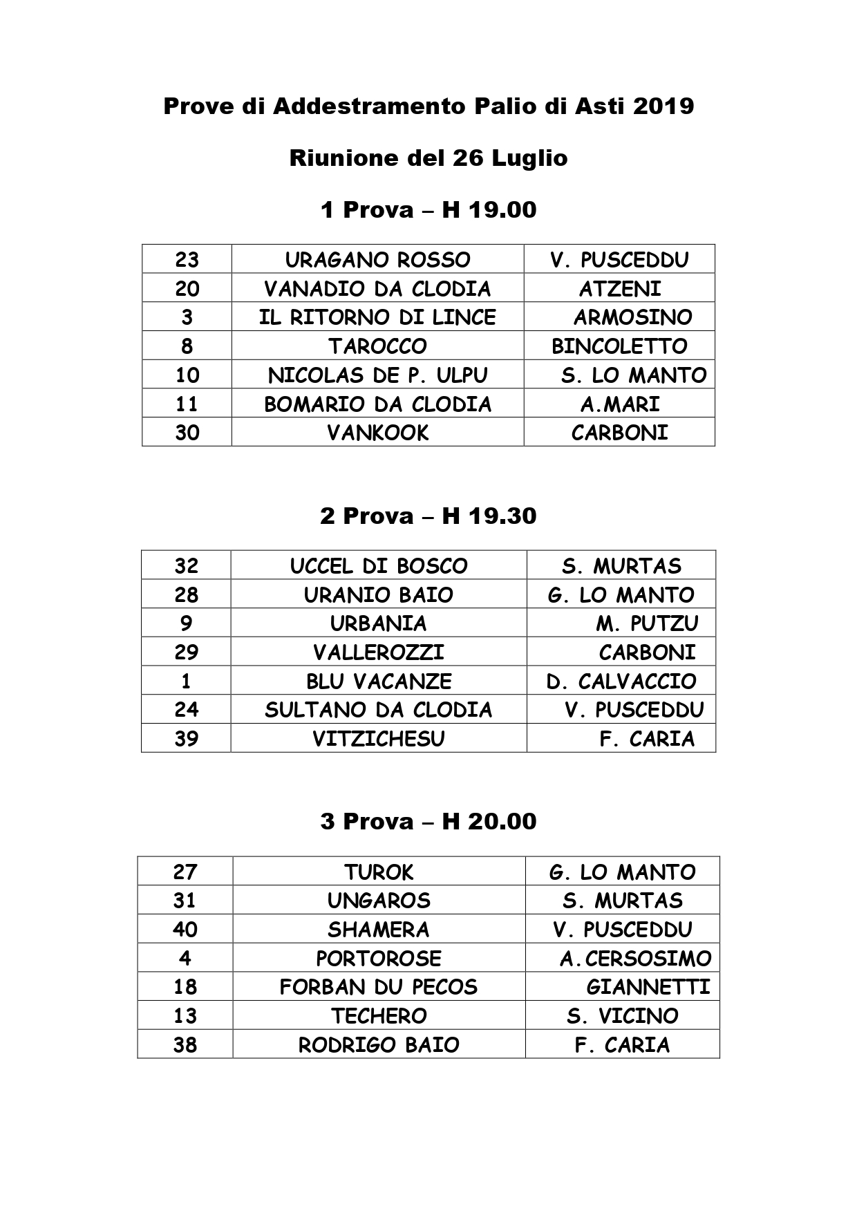 Mi sono da poco giunte le Prove delle Corse di Addestramento al Palio di domani 26/07 che si svolgeranno come sempre sulla Pista della Stadio Censin Bosia. Si tratta di sei Prove con la prima in prgramma alle ore 19.00 circa e l’ultima in programma alle ore 21.30 circa.