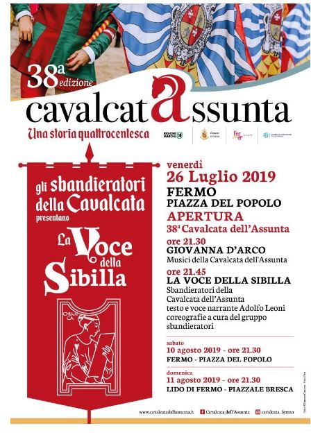 Alle 21.30 sarà il gruppo dei tamburini guidato da Marco Mannucci ad aprire la serata con l’esibizione dedicata alla “pulzella d’Orleans”, lo spettacolo dal titolo “Giovanna D’Arco”. Alle 21.45 piazza del Popolo sarà invece il palco de “La Voce della Sibilla”, lo spettacolo dei sbandieratori della Cavalcata dell’Assunta.