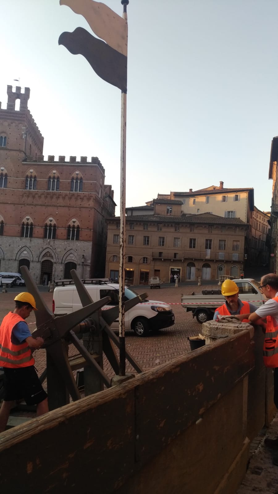 Procedono veloci le fasi di allestimento della Piazza del Campo. Oggi 21/06 sono stati montati gli steccati e il Palco dei Giudici. La piazza assume sempre di più il suo classico aspetto paliesco e i cuori dei contradaioli iniziano a battere velocemente, il Palio si avvicina a grandi falcate.