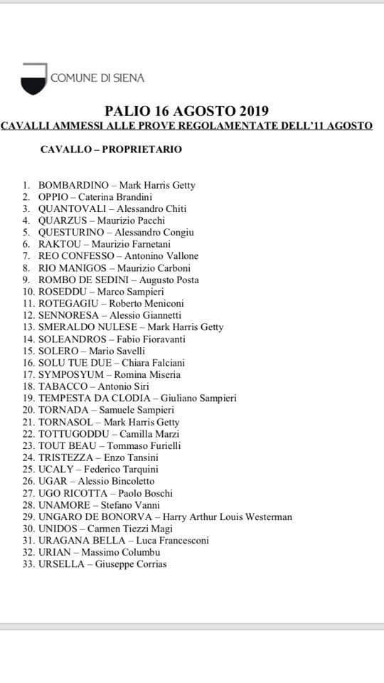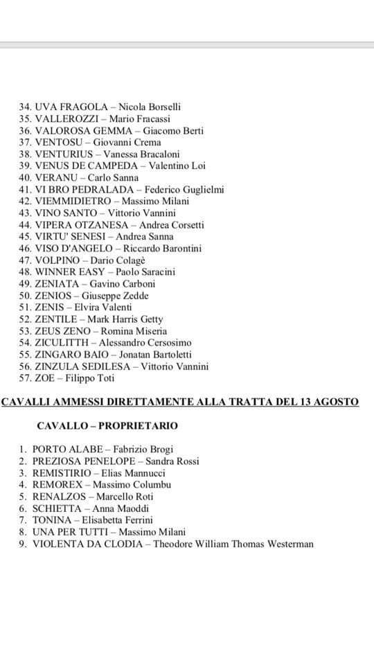 I cavalli, ammessi direttamente alla Tratta del 13 agosto, che dovranno essere presentati dalle ore 6.30 alle 7.30, sono: