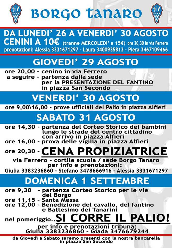 Ecco qua le locandine della Settimana palio 2019 e della Cena Propiziatrice 2019, tutte organizzate dal Comitato Palio del B orgo Tanaro-Trincere-Torrazzo, che si svolgeranno presso la sede in Via Ferrero ad Asti.