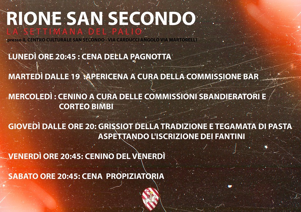 Palio di Asti, Rione San Secondo: 25-31/08 ” Settimana Biancorossa” Il Rione San Secondo organizza nel periodo 25.31/08 la “Settimana Biancorossa”. Per info e partecipare guardare la locandina sotto Condividi sul web: Fai clic per condividere su Facebook (Si apre in una nuova finestra) Facebook Fai clic per condividere su WhatsApp (Si apre in una nuova finestra) WhatsApp Fai clic per condividere su Telegram (Si apre in una nuova finestra) Telegram Fai clic per condividere su X (Si apre in una nuova finestra) X Fai clic qui per stampare (Si apre in una nuova finestra) Stampa Fai clic per inviare un link a un amico via e-mail (Si apre in una nuova finestra) E-mail Mi piace Caricamento... Correlati