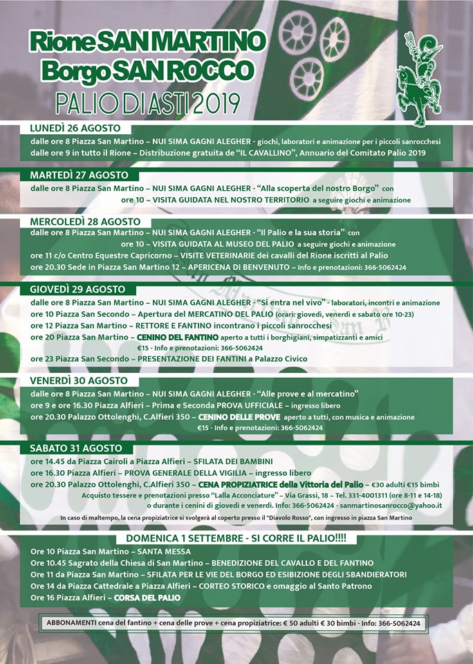 - 🍝 giovedì alle 20 in Piazza San Martino il “Cenino del fantino” a prezzi popolari, per poi accompagnare tut in bloch il nostro fantino alla cerimonia dell’investitura in Municipio sulle note della sanrocchese 🎶🔝