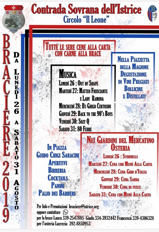 La Contrada dell’Istrice organizza per periodo 26-31/08. il “Braciere 2019”.