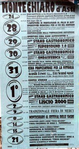 A Montechiaro, irrompe la festa patronale e, come per incanto, grazie al comitato palio, si colora di bianco celeste, avvisando la popolazione che il Palio è alle porte….si inizia il 28 con l’anteprima, poi sale in scena la pro loco con stand gastronomici e balli, sabato 31 cena propiziatrice per la vittoria, domenica 1° settembre la corsa…e che s. Bernardo..ci assista….alla sera ancora balli e gastronomia….sperando di far festa anche noi…nei prossimi weekend di settembre festival delle sagre con la pro loco, memorial di tamburello ad alta definizione in ricordo di Beppe ed Angelo Tirone a muro, a campo libero 7° memorial Nazario Tirico…un mese di avvenimenti spumeggianti…..all’insegna del palio, della festa patronale, sagre e tambass….buon divertimento….