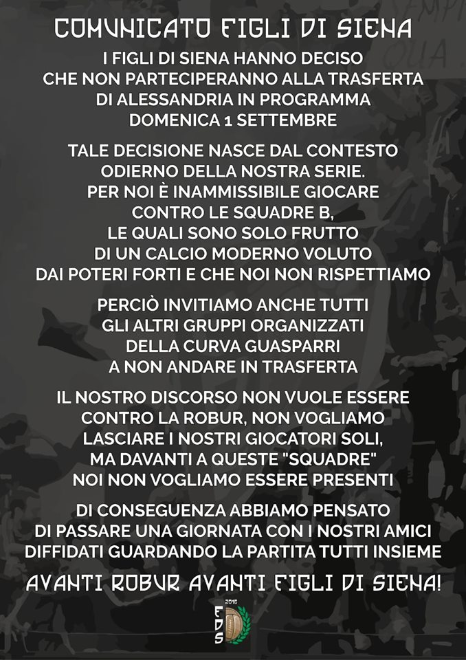 Siena, Robur Siena: I Figli di Siena ( FdS ) disertano la trasferta con la Juventus U23 di Domenica 01/09 Ecco qua sotto il Comunicato dei FdS dove comunicato che diserteranno la trsferta di domenica 01/09 ad Alressandria contro la Juventus U23 Condividi sul web: Fai clic per condividere su Facebook (Si apre in una nuova finestra) Facebook Fai clic per condividere su WhatsApp (Si apre in una nuova finestra) WhatsApp Fai clic per condividere su Telegram (Si apre in una nuova finestra) Telegram Fai clic per condividere su X (Si apre in una nuova finestra) X Fai clic qui per stampare (Si apre in una nuova finestra) Stampa Fai clic per inviare un link a un amico via e-mail (Si apre in una nuova finestra) E-mail Mi piace Caricamento... Correlati