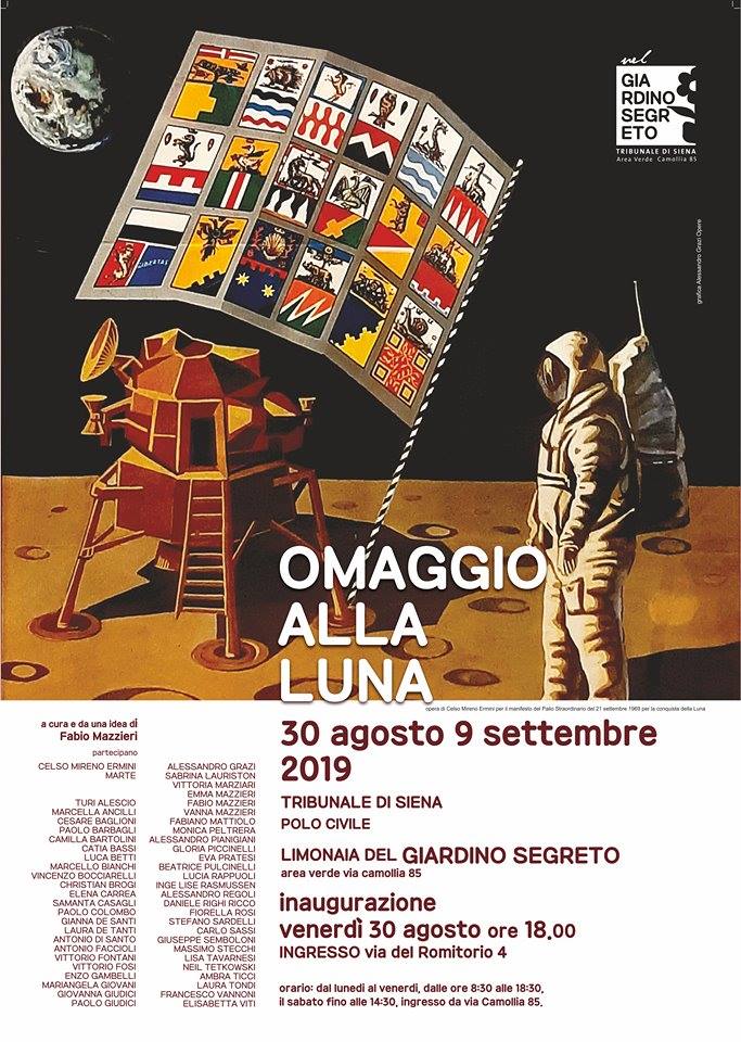 Siena: 30/08-09/09 “Omaggio alla Luna” Omaggio alla Luna, 50 anni, 1969 Palio straordinario a Siena.Celso Mireno Ermini, Marte e tanti artisti internazionali. Presso la Limonaia del Tribunale Civile di Siena, in Via del Romitorio 4 a Siena Condividi sul web: Fai clic per condividere su Facebook (Si apre in una nuova finestra) Facebook Fai clic per condividere su WhatsApp (Si apre in una nuova finestra) WhatsApp Fai clic per condividere su Telegram (Si apre in una nuova finestra) Telegram Fai clic per condividere su X (Si apre in una nuova finestra) X Fai clic qui per stampare (Si apre in una nuova finestra) Stampa Fai clic per inviare un link a un amico via e-mail (Si apre in una nuova finestra) E-mail Mi piace Caricamento... Correlati