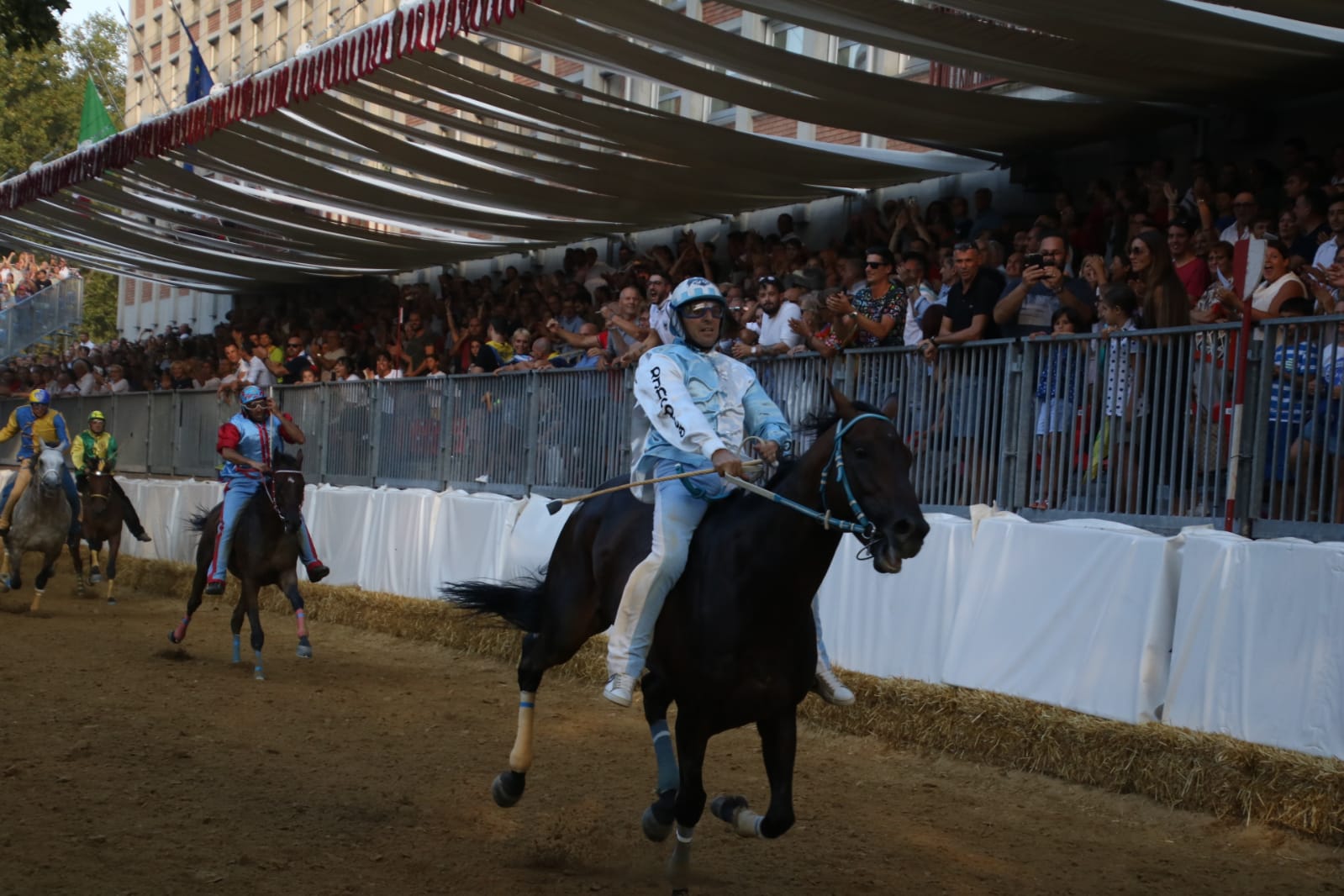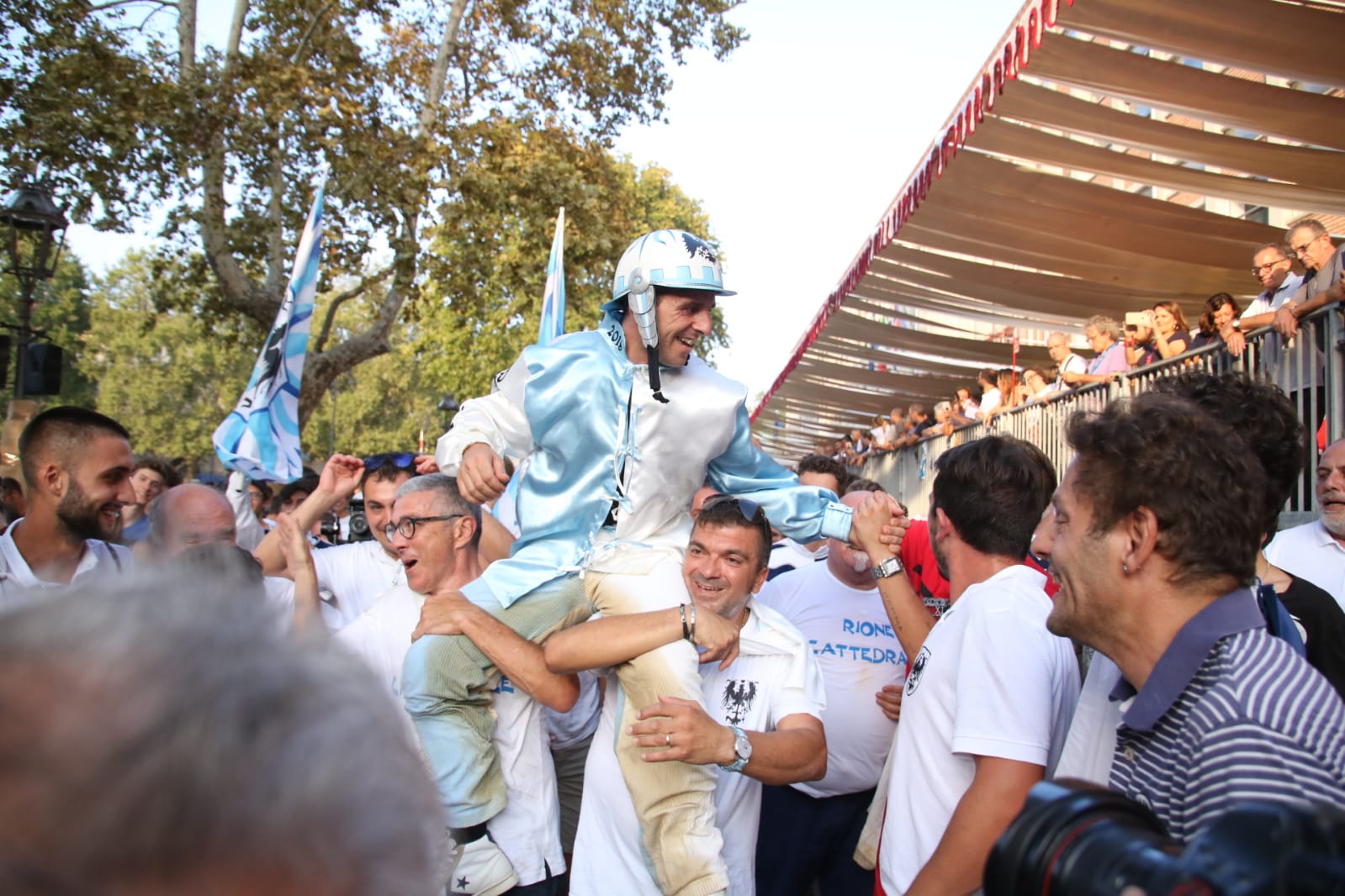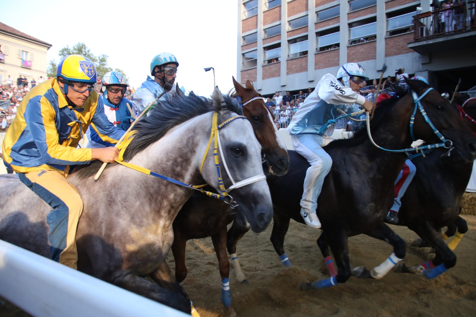 Riavvogliamo il nastro e torniamo indietro. Il Rione Cattedrale ha deciso anche per il palio del 01/09 di affidarsi al fantino Dino Pes detto “Velluto” e al cavallo Ribelle da Clodia, che già durante l’edizione 2018 sono andati per un pelo a vincere il Palio, ma quella volta hanno trovato sulla loro strada moncalvo con una Calliope da Clodia e un bravo Federico Arri detto “Ares”, che con una corsa perfetta e senza sbavature hanno negato la vittoria al Rione Cattedrale. ma quest’anno no, ieri 01/09 Dino Pes detto “Velluto”, con la rabbia e la determinazione che lo constrddistinguono da sempre, con il suo essere un ragazzo buono, dolce, umile e bravo, un ragazzo d’oro, ieri 01/09 ha ripagato il Rione Cattedrale con una corsa sontuosa e mai in discussione, riportando al Rione Bianco-Azzurro una vittoria che mancava da troppo tempo, ben 42 anni.
