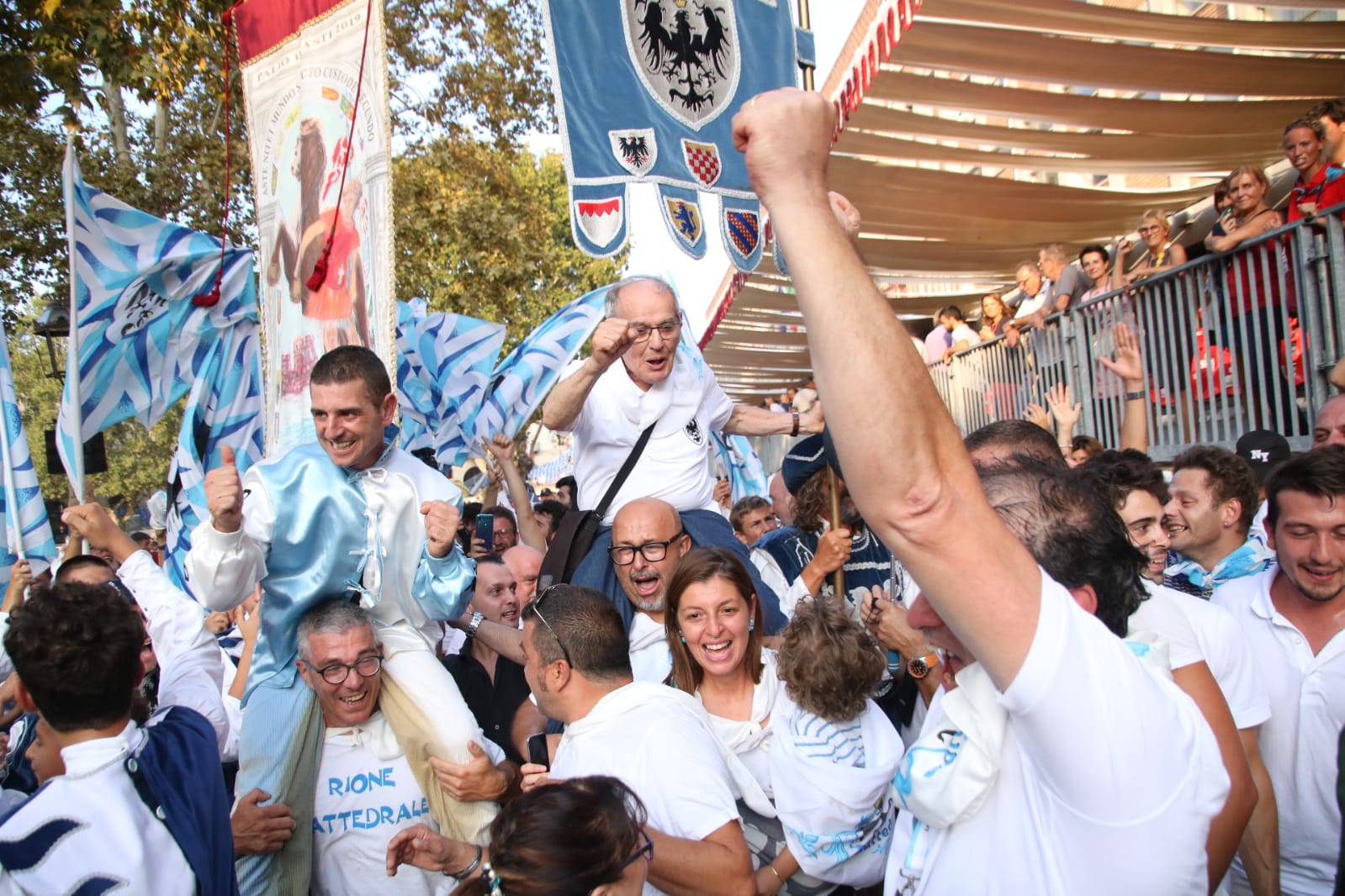 E’ tutto vero, e’ tutto vero, Cattedrale ha vinto dopo 42 lunghi anni di attesa il Palio 2019, si è tolta l’ewtichetta di “Nonna del Palio”, che ora passa al Rione San Pietro, e può festeggiare la tanto agognata e desiderata vittoria, portando il Drappo del Palio dei Borghi e Rioni Cittadini, in giro per le vie di Asti, fino a raggiungere Palazzo del Michelerio, sede del Rione, al grido di “I Campioni della Piazza siamo noi”.