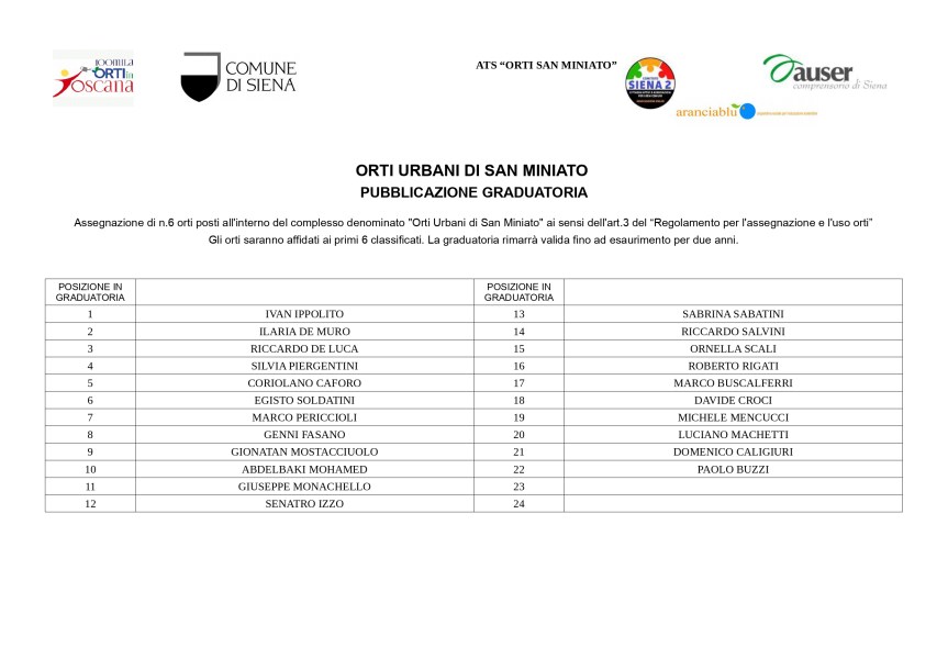 Si conclude positivamente il bando per l’assegnazione di orti posti all’interno del complesso denominato “Orti Urbani di San Miniato”, sviluppato nell’ambito del progetto regionale “100mila orti in Toscana” ( http://www.regione.toscana.it/speciali/centomila-orti ).