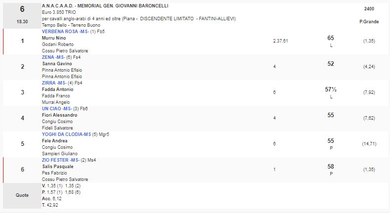 6^ Corsa Premio ANACAAD – Memorial Gen. Giovanni Baroncelli vinta da Verbena Rosa da Fisch e Pintadera Bella di proprietà di Cossu Pietro Salvatore e allenato da Godani Roberto
