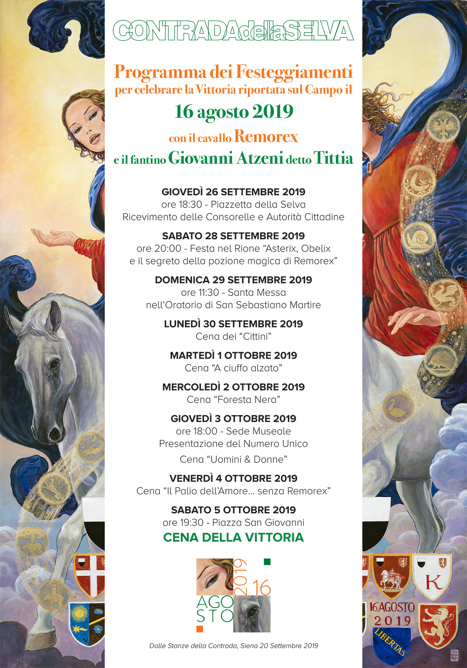Ecco qua di seguito il Programma dei Festeggiamenti della Contrada della Selva per la Vittoria del Palio del 16/08: