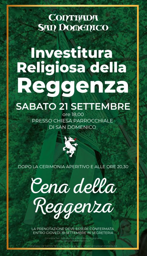 Sabato 21/09 alle ore 18.00 presso la Chiesa Parrocchiale della Contrada sarà effettuata l’Investitura Religiosa della Reggenza della Contrada.