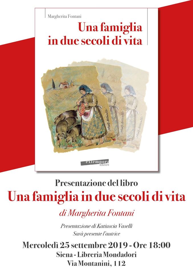 Una famiglia in due secoli di vita è il titolo del settimo romanzo di Margherita Fontani, edito da Extempora, Siena, che verrà presentato mercoledì 25 settembre 2019 alle ore 18.00 alla libreria Mondadori di Siena.