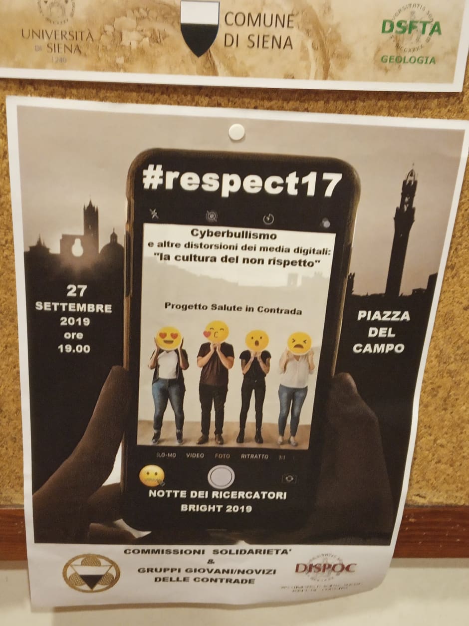Si tratta di un incontro per sensibilizzare i giovani delle Contrade su un argomento molto delicato e riguarda il Cyberbullismo e altre distorsioni dei media digitali, “la cultira del non rispetto”. Questo incontro fa parte del progetto Salute in Contrada ed è organizzato in concomitanza con “la Notte dei Ricercatori, Bright 2019”.