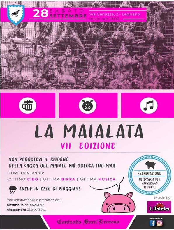 Sabato 28 settembre, dalle ore 19, presso il maniero di via Canazza 2, ritorna la sagra più golosa che ci sia: la maialata, giunta ormai alla sua VII edizione.