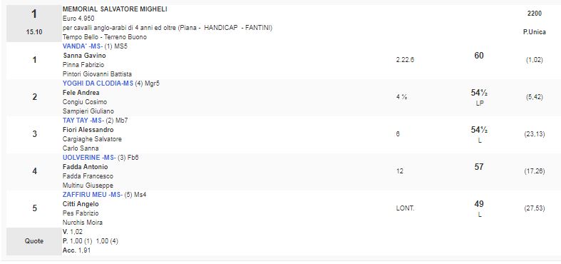 1^ Corsa Premio Memorial Salvatore Migheli vinta da Vandà da Ispanico Sauro e Nevadia di proprietà di Pintori Giovan Battista e allenato da Pinna Fabrizio