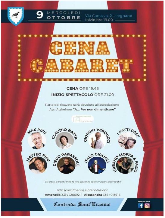 Mercoledí 9 Ottobre 2019 Via Canazza ospiterà alcuni dei personaggi che hanno fatto la storia della nostra comicitá; la serata inizerà dapprima con un’ottima cena, per poi proseguire con lo spettacolo di cabaret.