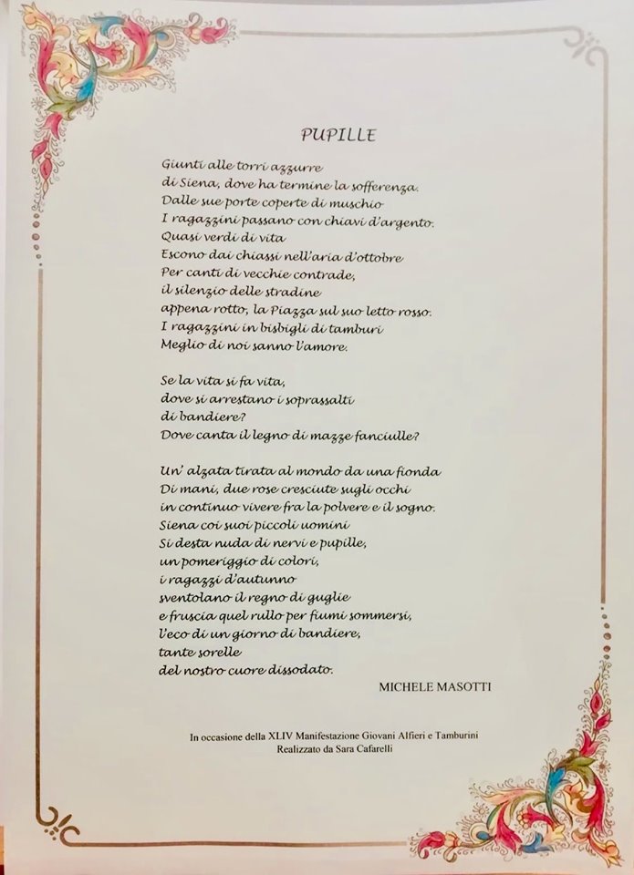 Presentato nella sala delle Vittorie della Contrada della Torre il premio che si aggiudicherà la comparsa vincitrice della XLIV Manifestazione per giovani alfieri e tamburini, realizzato da Sara Cafarelli accompagnato da una poesia di Michele Masotti