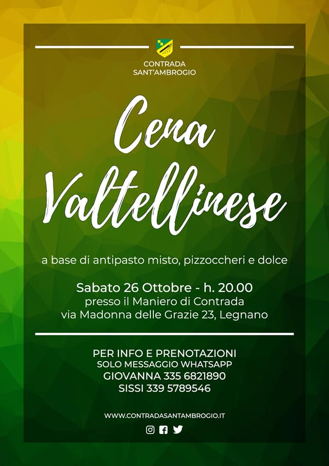 Palio di Legnano, Contrada Sant’Ambrogio: 26/10 Cena Valtellinese Cosa c’è di meglio di un buon piatto di pizzoccheri ad Ottobre?!😋 🔜CENA VALTELLINESE 🗓 Sabato 26 Ottobre ⏰ Ore 20.00 📍Maniero di Contrada 📲 Gio 3356821890 📲 Sissi 3395789546 Menù: Antipasto misto Pizzoccheri Dolce Condividi sul web: Fai clic per condividere su Facebook (Si apre in una nuova finestra) Facebook Fai clic per condividere su WhatsApp (Si apre in una nuova finestra) WhatsApp Fai clic per condividere su Telegram (Si apre in una nuova finestra) Telegram Fai clic per condividere su X (Si apre in una nuova finestra) X Fai clic qui per stampare (Si apre in una nuova finestra) Stampa Fai clic per inviare un link a un amico via e-mail (Si apre in una nuova finestra) E-mail Mi piace Caricamento... Correlati