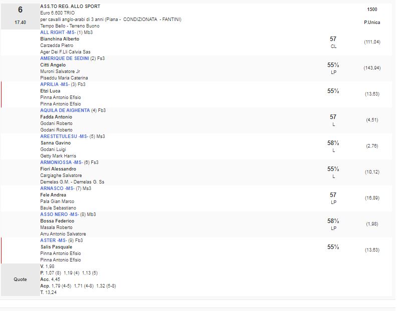 Ippica, Sassari: Oggi 14710 Risultati 6^ Corsa Vince Asso nero 6^ Corsa Ass.to Reg. allo Sport vinta da Asso Nero da Kentucky Home e Noha di proprietà di Arru Antonio Salvatore e allenato da Masala Roberto Condividi sul web: Fai clic per condividere su Facebook (Si apre in una nuova finestra) Facebook Fai clic per condividere su WhatsApp (Si apre in una nuova finestra) WhatsApp Fai clic per condividere su Telegram (Si apre in una nuova finestra) Telegram Fai clic per condividere su X (Si apre in una nuova finestra) X Fai clic qui per stampare (Si apre in una nuova finestra) Stampa Fai clic per inviare un link a un amico via e-mail (Si apre in una nuova finestra) E-mail Mi piace Caricamento... Correlati