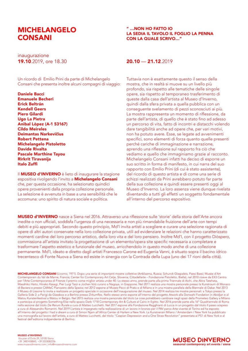 Michelangelo Consani infatti ha deciso di esporre un suo racconto in forma di manifesto in cui narra del suo rapporto con Emilio Prini (di cui è stato assistente )e di come una serie di schizzi realizzati da questo, avrebbero potuto far parte della sua collezione e quindi essere presenti oggi al Museo d’Inverno. La loro assenza viene dunque rivelata diventando a tutti gli effetti un soggetto fondamentale all’interno del percorso espositivo.