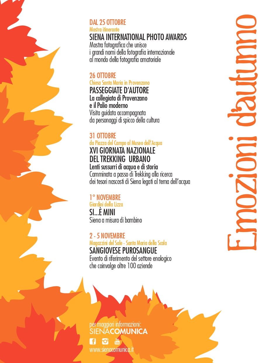 Programma di iniziative collaterali alla XVI Giornata Nazionale del Trekking Urbano del 31 ottobre, un calendario di eventi per gli amanti della fotografia, per chi vuole scoprire luoghi meno conosciuti della Città, per gli appassionati e gli operatori del settore enologico. Il pomeriggio del I° novembre sarà dedicato ai più piccoli, un’occasione educativa e didattica per far conoscere il reale funzionamento della propria Città.