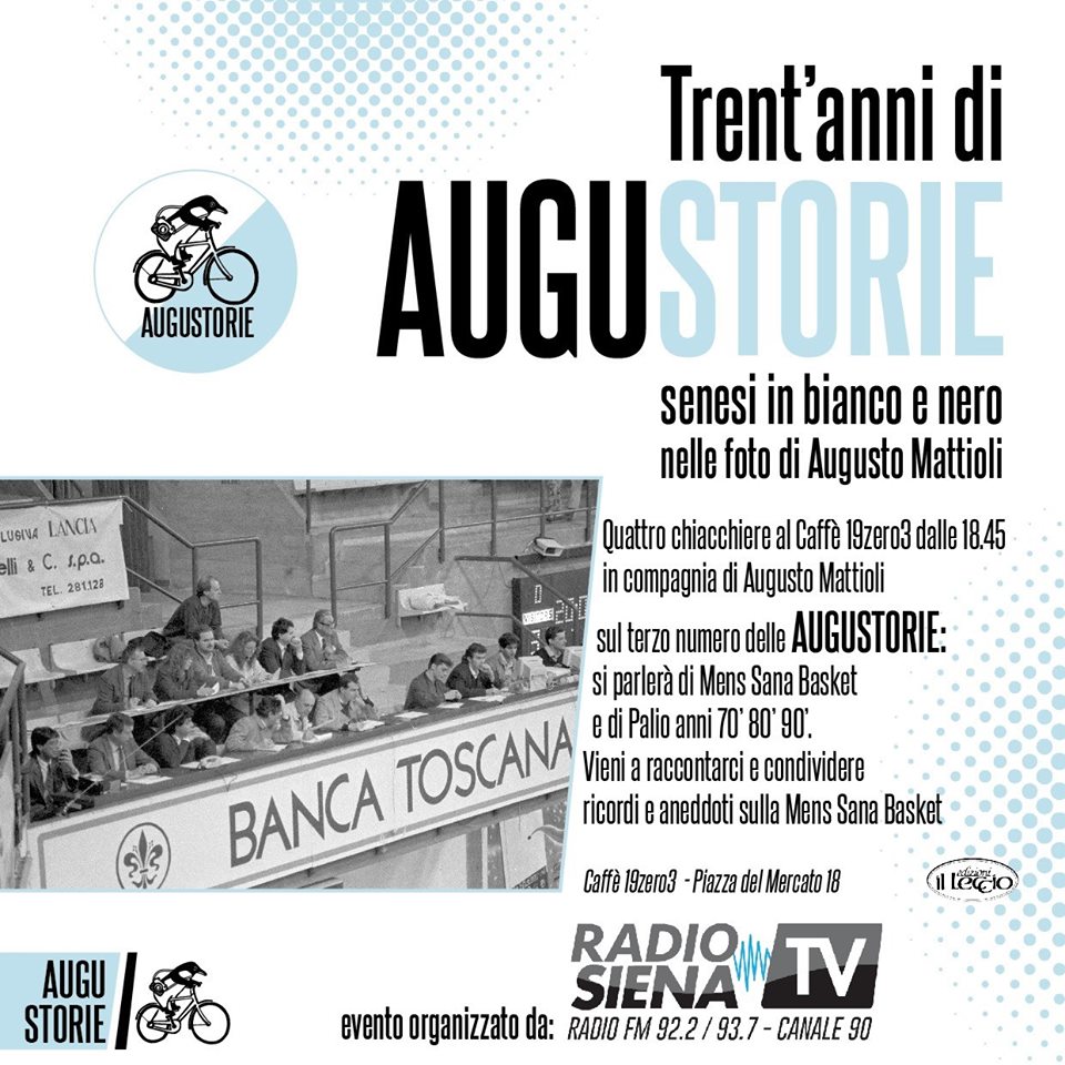 Sabato 26/10 Quattro chiacchiere sul terzo numero delle Augustorie in compagnia di Augusto Mattioli al Caffè 19zero3 : si parlerà della Polisportiva Mens Sana e del Palio negli anni 70, 80 e 90. Vieni a raccontarci e condividere ricordi e aneddoti sulla Mens Sana Basket!