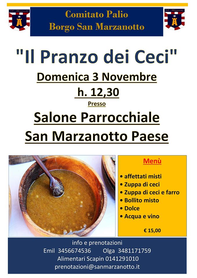 Domenica 3 Novembre ritorna il tradizionale “Pranzo dei ceci”. Vi aspettiamo nel Salone Parrocchiale di San Marzanotto alle ore 12,30. Sulla locandina il menù completo e i numeri di telefono per prenotarsi.