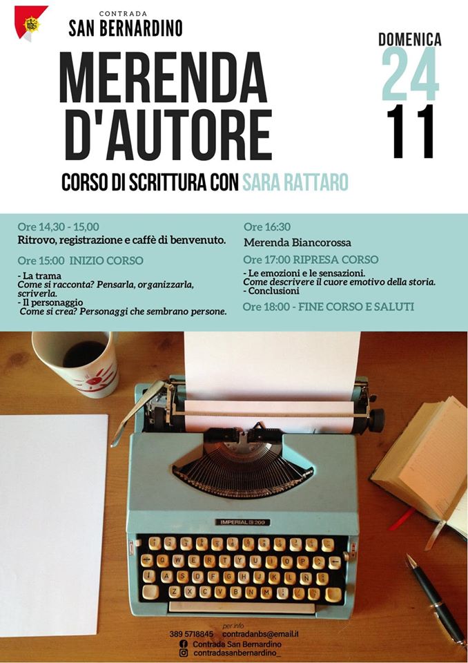 Ecco qualcosa che fa per te! Domenica 24 Novembre avremo il piacere di ospitare, per la seconda volta, Sara Rattaro in occasione di: “Merenda d’Autore – Corso di scrittura con Sara Rattaro” 📝