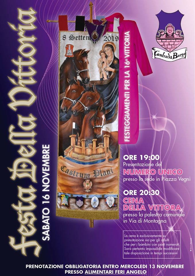 La Contrada Borgo è lieta di invitarvi alla Festa della Vittoria, oggi sabato 16 novembre per la sedicesima Vittoria riportata in piazza Garibaldi. Il programma della serata prevederà: