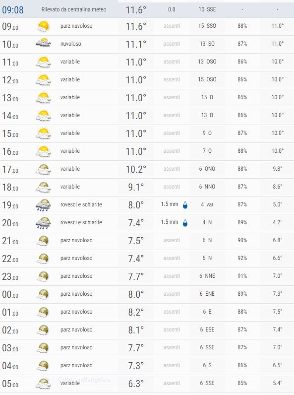 Al mattino Coperto con possibili pioviggini, al pomeriggio Nubi sparse e schiarite, la sera Nubi sparse con possibili piovaschi, la notte Nubi sparse con ampie schiarite.