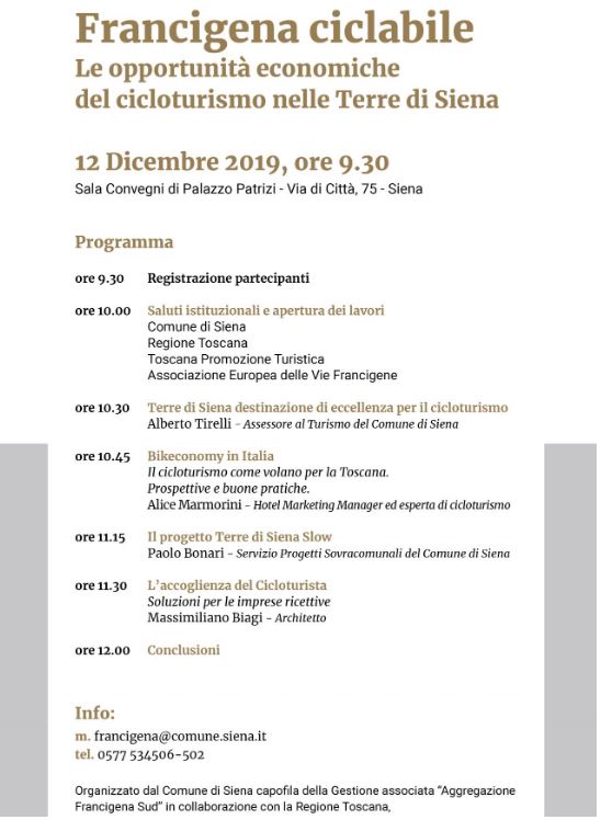 Il convegno si terrà il 12 Dicembre 2019 ore 9.30 presso la Sala Convegni, Palazzo Patrizi, Via di Città, 75, Siena ed è rivolto agli imprenditori del turismo al fine di cogliere le opportunità di un settore in rapida crescita, come oggi è quello del cicloturismo.