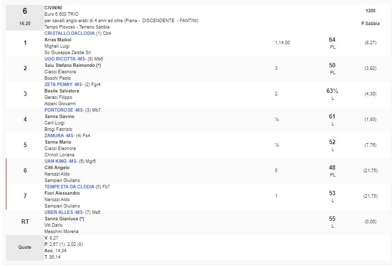 6^ Corsa Premio Civinini vinta da Cristallo da Clodia da Lord de Bonorva e Bosilvia da Clodia di proprietà di Sc Giuseppe Zedde Srl e allenato da Migheli Luigi