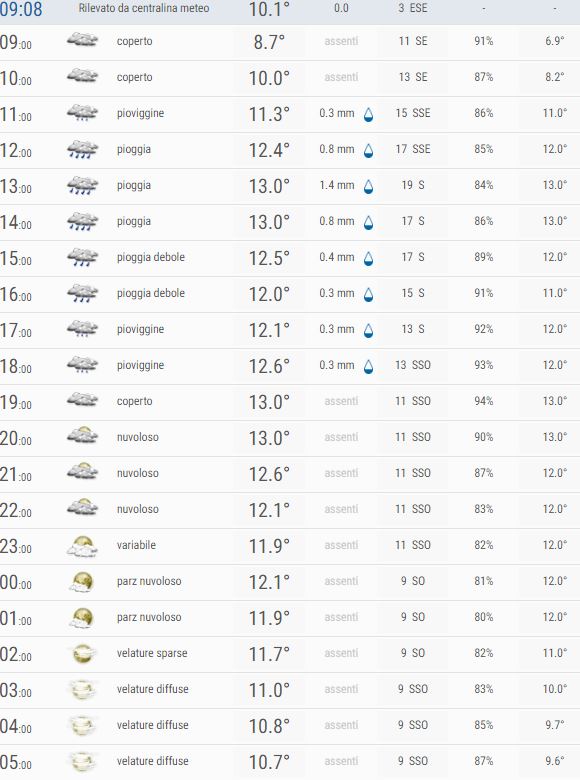 Al mattino Coperto con possibili pioviggini, al pomeriggio Coperto con pioggia debole, la sera Coperto con possibili pioviggini, la notte Nuvoloso per velature e stratificazioni anche compatte.