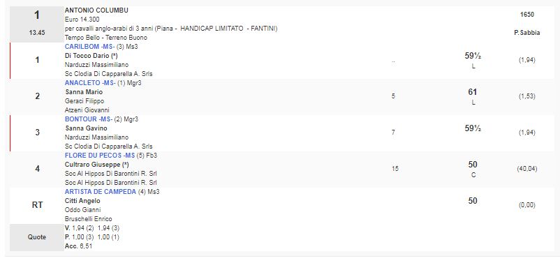 1^ Corsa Premio Antonio Columbu vinta da Carilbom da Bombolino e Carillon Tango di proprietà di Sc Clodia di Capparella A Srls e allenato da Narduzzi Massimiliano