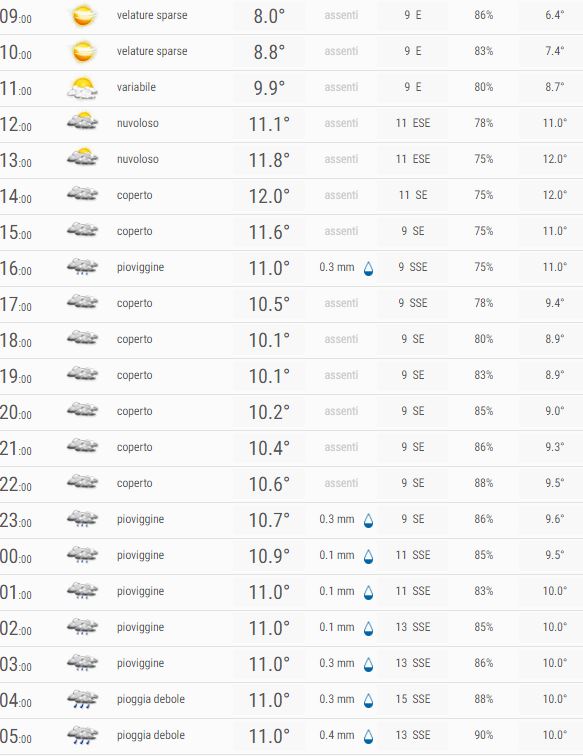 Al mattino Visibilita’ ridotta per banchi di nebbia, al pomeriggio Coperto con possibili pioviggini, la sera Coperto con possibili pioviggini, la notte Coperto con pioggia debole intermittente.