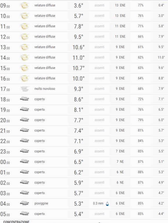 Al mattino Nuvoloso per velature e stratificazioni anche compatte, al pomeriggio Nuvoloso per velature e stratificazioni anche compatte, la sera Molto nuvoloso o coperto, la notte Coperto con possibili pioviggini.