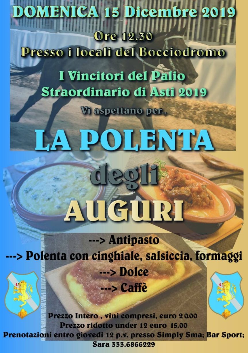 Il Comitato Palio Baldichieri, i vincitori del Palio Straordinario 2019, vi aspettano presso i locali del Bocciodromo, domenica 15/12 dalle ore 12.30, alla “La Polenta degli Auguri”. Sarà l’occasione per scambiarci gli auguri di Natale e brindare a questo 2019 che ci ha regalato il sogno più grande!