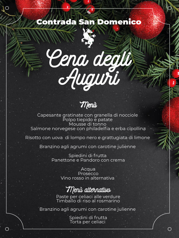 La Contrada San Domenico, per il 21/12 dalle ore 20.00 in poi organizza la Cena degli Auguri 2019, presso il Maniero di Via Bixio.