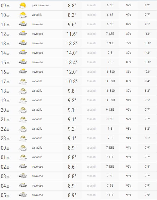 Al mattino Nubi sparse con ampie schiarite, al pomeriggio Nuvoloso con locali aperture, la sera Nubi sparse e schiarite, la notte Nuvoloso con locali aperture.