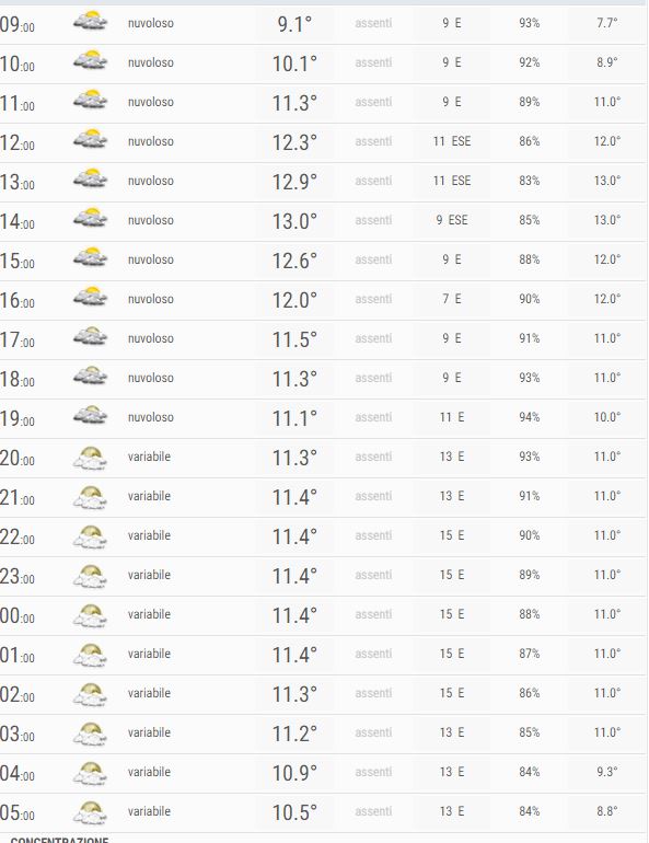 Al mattino Nuvoloso con locali aperture, al pomeriggio Nuvoloso con locali aperture, la sera Nuvoloso con locali aperture, la notte Nubi sparse e schiarite.